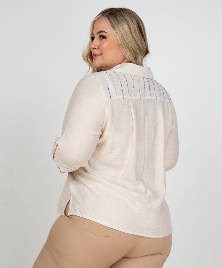 Resalta tu estilo con esta blusa talla grande, diseñada en tela ligera y fresca que brinda comodidad durante todo el día. Su diseño clásico con cuello camisero, botones frontales y manga 3/4 se complementa con delicados bordados de rayas que aportan un toque moderno y elegante. Ideal para crear looks casuales o de oficina, combinando perfectamente con jeans o pantalones.