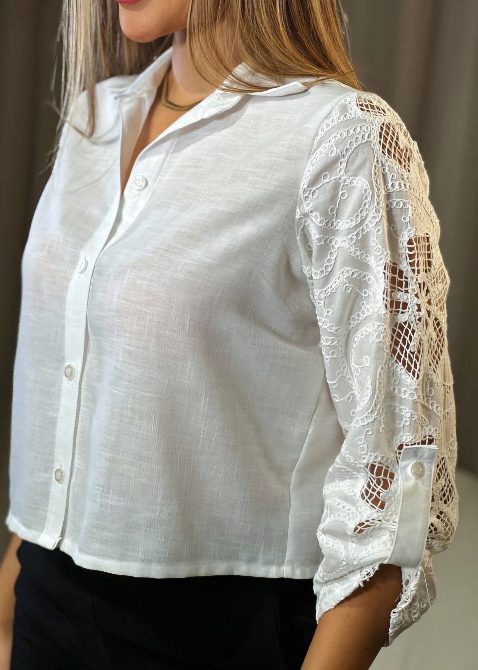 Esta blusa blanca de lino destaca por su diseño elegante y femenino, combinando materiales ligeros con detalles sofisticados. Su corte holgado y fluido la convierte en una prenda cómoda y versátil para diversas ocasiones.