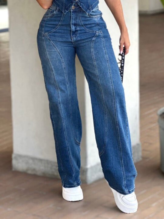 Conjunto Bota Recta en Denim Stretch que destaca por su delicado escote frontal y detalles únicos que marcan la diferencia.