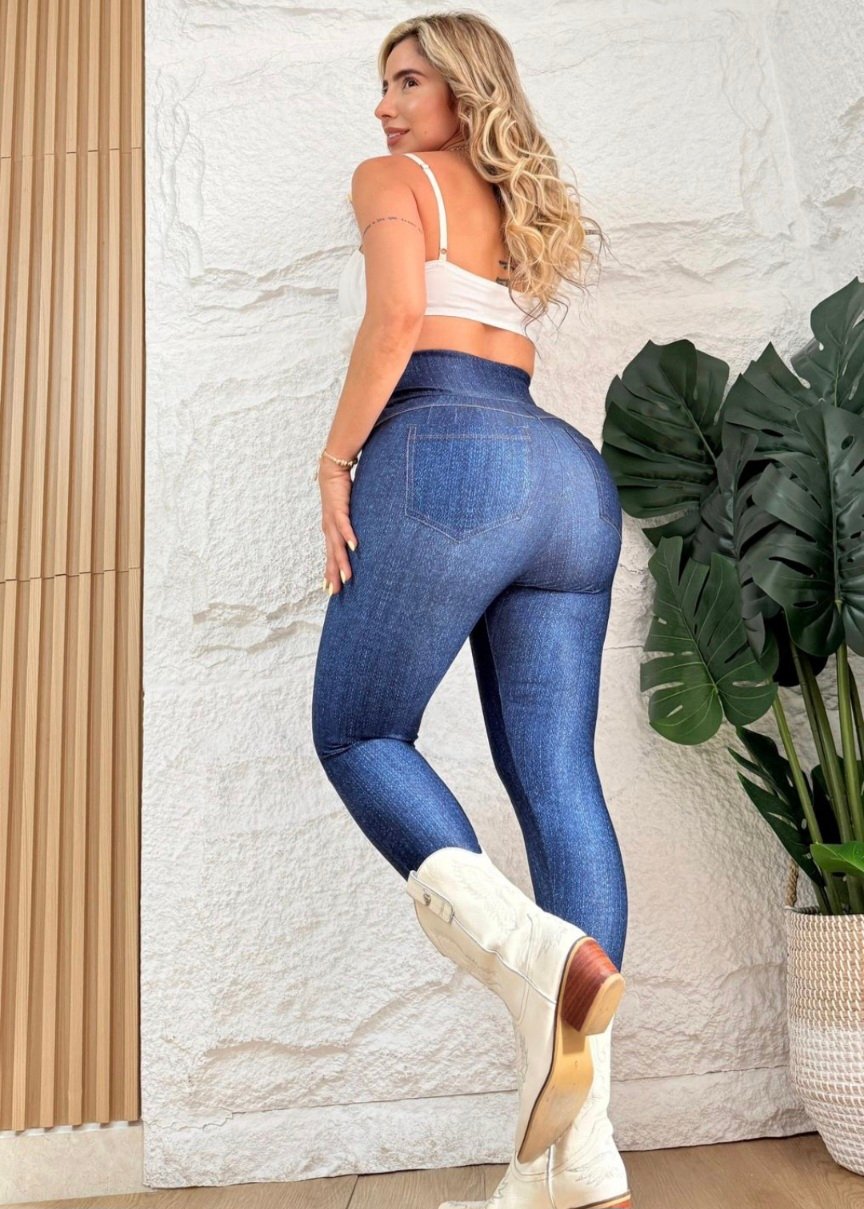 Leggins moldeador con faja incorporada para control del abdomen bajo y realce de glúteos, apariencia de tela jeans (Jeggins) en tono oscuro. No transparenta y asemeja perfectamente la apariencia de un jeans pero con la comodidad de un leggins.