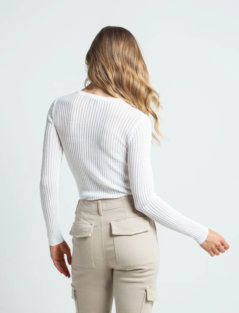 Buzo tejido cuello redondo y silueta ajustada. Diseño tejido a rayas. Perfecto para favorecer tu figura y combinar con tus accesorios favoritos. La modelo usa un tejido talla S.